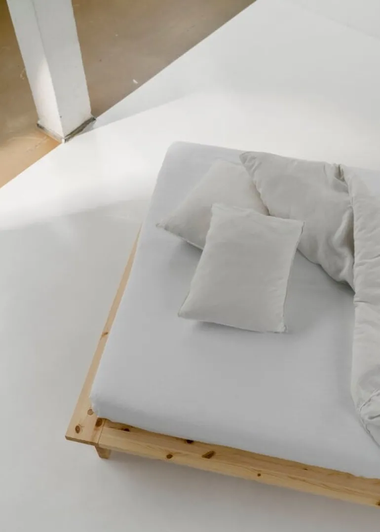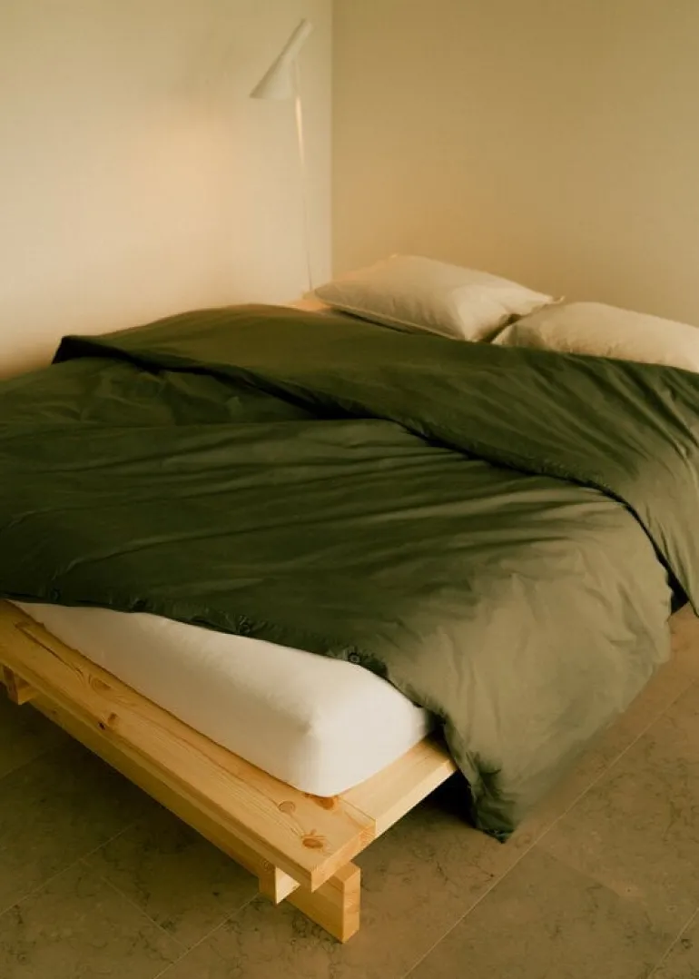 Den minimalistiska sängstommen är tillverkad av robusta furuplankor och monteras utan skruvar, och ger en stabil bas till din madrass – sängstommen är designad för madrasser på 180 cm. Furumaterialet, som är känt för sin livfulla karaktär, utvecklar unika märken och repor med tiden, vilket bara gör varje sängstomme ännu mer unik.