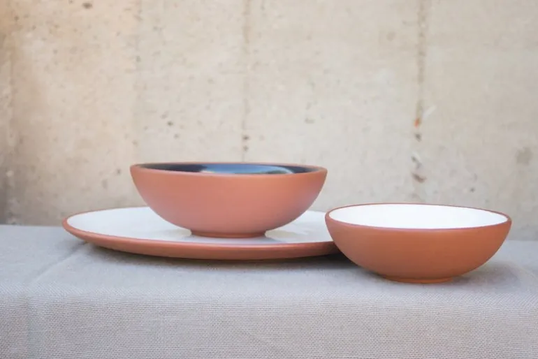 Vaidavas Earth-kollektion kombinerar lettiska keramiska traditioner och minimalistisk nordisk design. Earth-skålarna är tillverkade av lettiskt rött lera och har glaserats med färgad, blyfri glasyr på insidan, medan utsidan helt enkelt har polerats slät och lämnats oglaserad. De naturliga tonerna och de mjuka siluetterna i Earth-kollektionen ramar in maten vackert i både vardagliga och festliga dukningar.