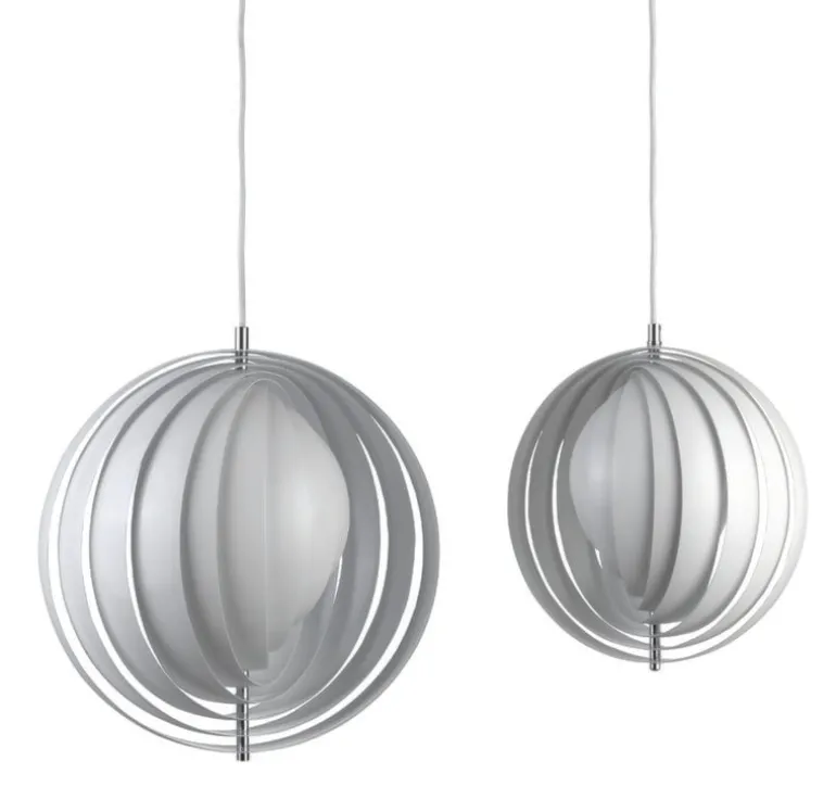 Moon-pendellampan skapades av Verner Panton 1960 och tillverkas idag av Verpan. Den är ett fantastiskt exempel på 1960-talets danska belysningsdesign. Pendellampan inspirerades av månens olika faser och består av fritt hängande ringformade lameller av stål. De öppnar sig som en fläkt och reflekterar mjukt och vitt ljus. Genom att justera stålringarna i olika lägen kan du leka med månens faser. Den distinkta armaturen är ett vackert blickfång ovanför matbordet eller i vardagsrummet.