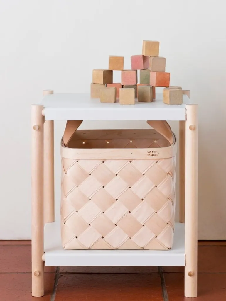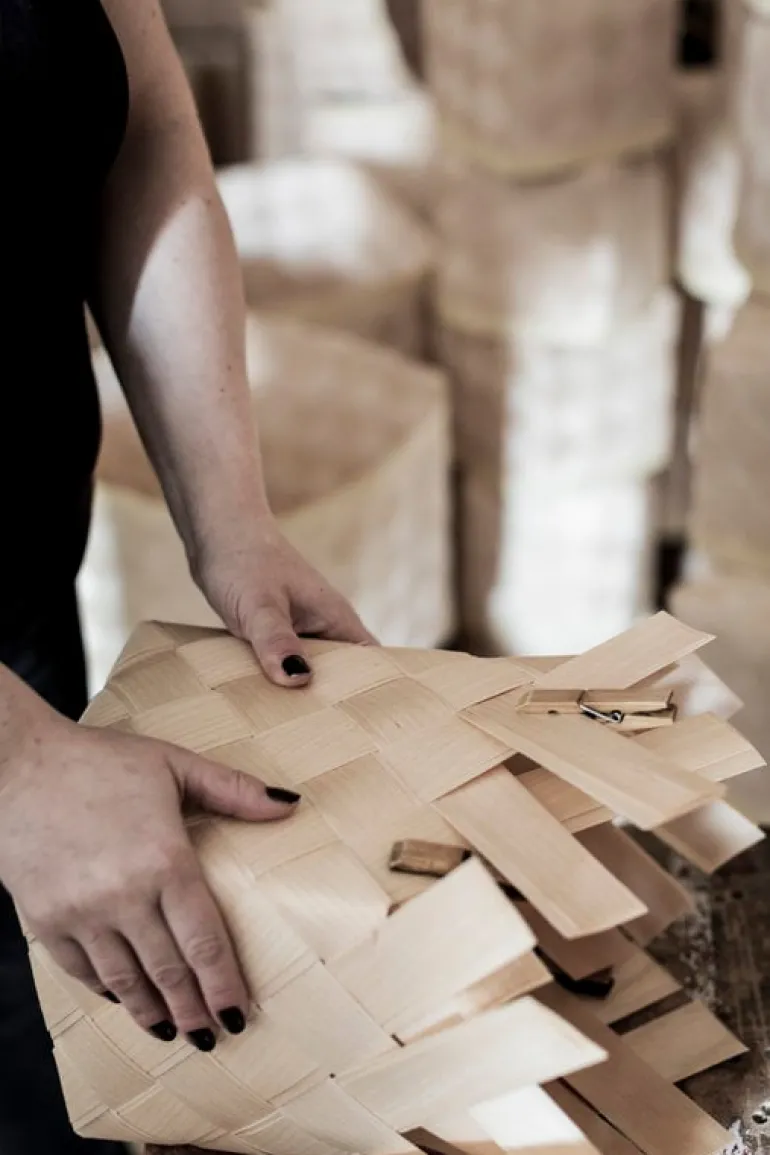 Lastu-korgen är en modern tolkning av den traditionella vävda näverkorgen. Lastu passar för all typ av förvaring, från leksaker och tidningar till kläder. Två lager av björk ökar tåligheten, medan vackra läderhandtag utgör en fin touch.
