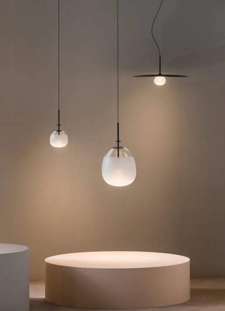 Pendellampan Tempo från Vibia stoltserar med en minimalistisk design som är baserad på geometriska former och växelverkan mellan direkt och indirekt ljus. Hänglampan Tempo, som består av en oval glaskupa och en armatur av metall, sprider ett milt sken och fungerar därför fint som hörnlampa eller fönsterlampa.