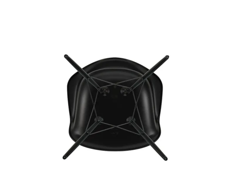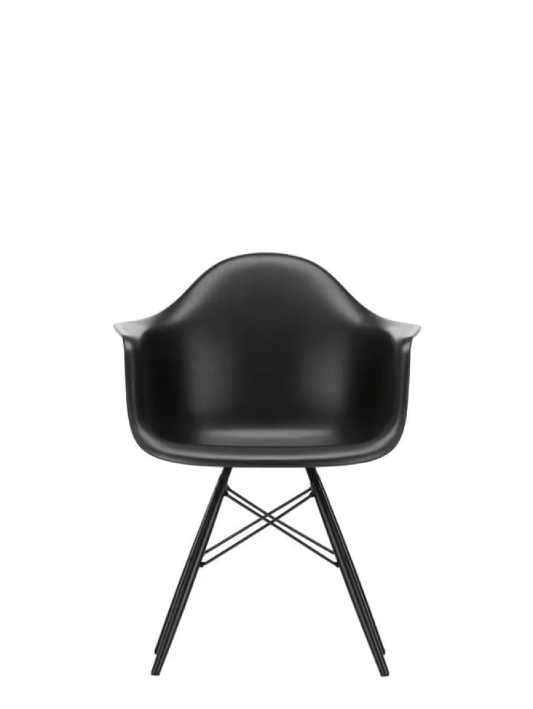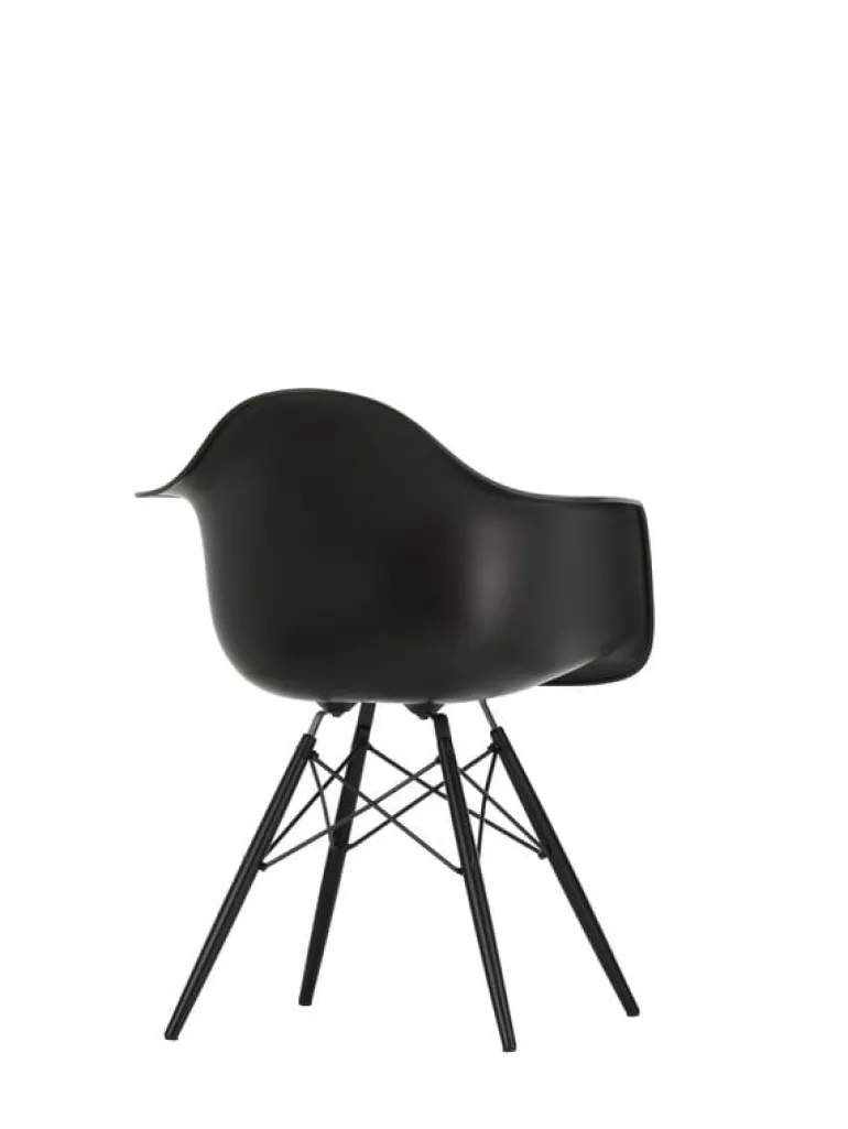 Vitras plastfåtölj Eames DAW består av en ram i trä kombinerat med en välvd plastsits. Namnet DAW kommer från orden Dining Height Armchair Wood Base.