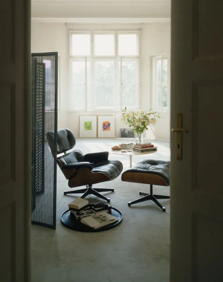 Vitras Eames Lounge Ottoman designades av Charles och Ray Eames, och är en klassiker från 1956. Paret Eames designade Lounge Ottoman till sin Lounge Chair, och ottomanens form och material speglar den ikoniska stolens eleganta utseende. Lounge Ottoman består av en fyrbent metallbas, formpressad plywood med faneryta och en sits klädd i läder. Vitras Lounge Chair och Ottoman är tidlösa designklassiker från 1900-talet.