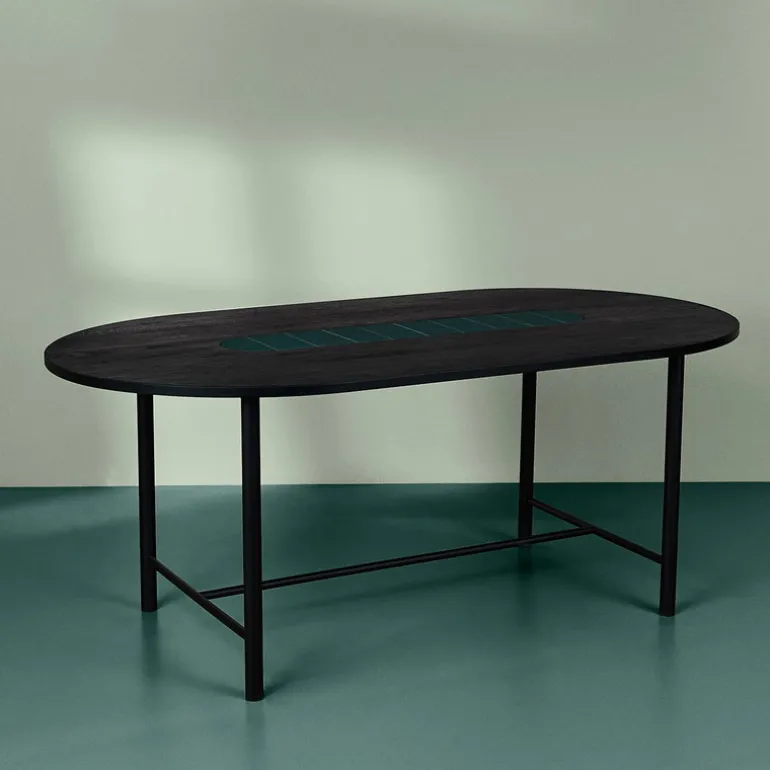 Be My Guest-matbordet, som designats av Charlotte Høncke för danska Warm Nordic, kombinerar en luftig metallram med en sofistikerad ekskiva och keramikplattor. Den 60-talsinspirerade raden med keramikplattor är både dekorativ och funktionell, eftersom du kan ställa varma tekannor och kastruller på den. Det lätta ovalformade Be My Guest-bordet kompletterar bänken från samma kollektion. En ljuvlig kombination av klassiska och moderna referenser: bänken och matbordet från Be My Guest-serien tillverkas i Danmark och släpptes 2017.