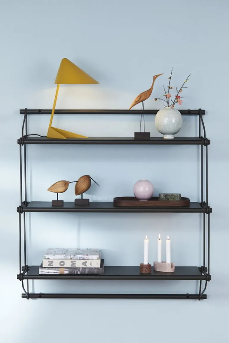 Vägghyllan Parade av Warm Nordic är en stilfull och rymlig kreation som passar till exempel böcker, köksburkar, eller mössor, halsdukar och handskar. Parade designades av nordiska duon Morten & Jonas och hämtar inspiration från både bagagehyllorna på tåg och 1960-talets hyllsystem. Hyllan har tillverkats i rent stål, vilket ger den en luftig men stark struktur med referenser till industriell design.