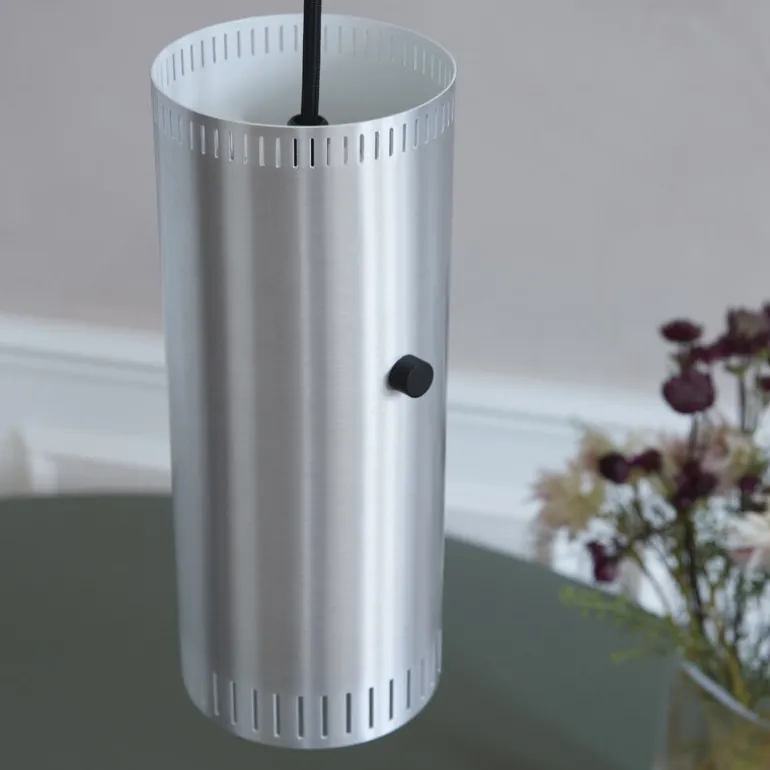 Warm Nordics taklampa Trombone Cylinder har en smal, cylindrisk metallskärm med en vit insida som reflekterar ljuset från båda ändarna av skärmen. Kanterna är perforerade med tunna vertikala slitsar, vilket gör att ljuset skiner igenom på ett vackert sätt. Kabeln har en svart textilfläta.