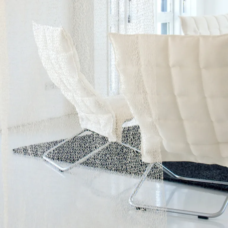 K-stolen är tillverkad av finska Woodnotes, och är en inbjudande fåtölj med ett bakåtlutat, elegant utseende som passar lika bra hemma som i offentliga miljöer. K-stolen har rörformad ram och avtagbar klädsel tillverkad av en smutsavvisande blandning av pappersgarn och bomull. De synliga delarna i stål är belagda med matt kromfinish. Komplettera med K-fotpallen för att göra stunderna i fåtöljen ännu bättre.