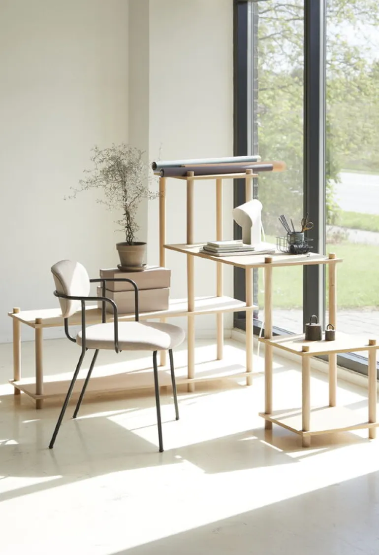 Frame-stolen från Woud för samman den minimalistiska formen med en bekväm sittupplevelse. Fåtöljen designades av Mario Tsai och består av en metallram med rör och klädda kuddar vars mjuka kurvor designats för att anpassa sig efter människokroppen.