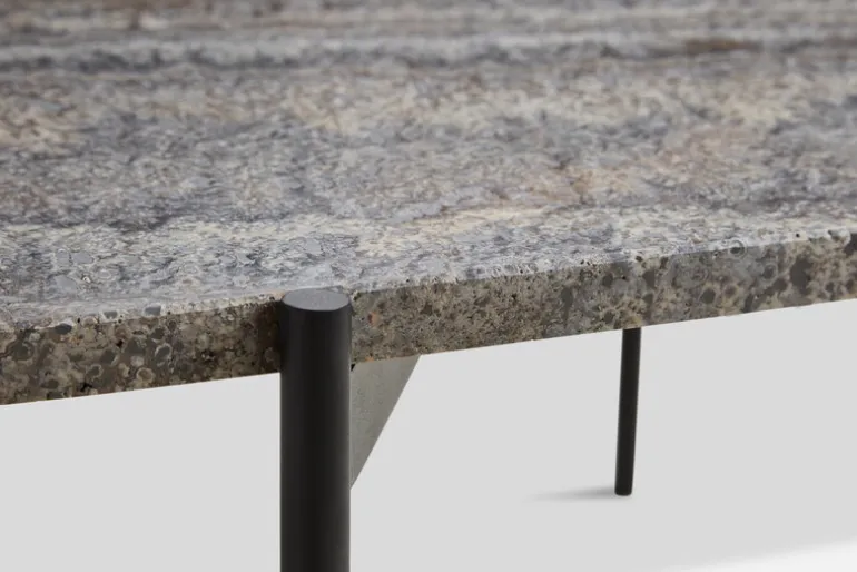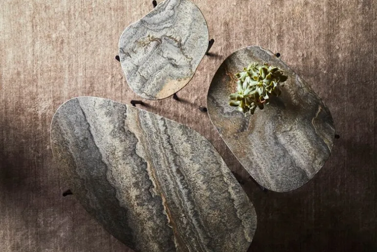 Wouds sidobord La Terra domineras av en minimalistisk look och en elegant, naturinspirerad design. Bordet består av en enkel metallram och en bordsskiva, tillverkad av travertin, med en organisk, oregelbunden form som påminner om stenar på stranden. När hon skapade bordssamlingen föreställde sig designern Agnes Morguet ett kargt, klippigt strandlandskap – hon ville översätta den lugna atmosfären från en barfota promenad till designen. Precis som varje sten på stranden är varje La Terra-bord unikt, eftersom mönstren och nyanserna på travertinskivan varierar från grått och beige hela vägen till svart och brunt.