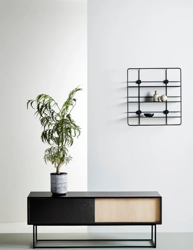 Sideboardet Virka kan användas som tv-bänk, växtbord eller som ett elegant förvaringsskåp. Virka, som skapades genom ett samarbete mellan danska designstudiorna Røpke Design och MOAKK, består av en luftig metallram och ett smalt skåp i svartmålad och naturlig ekfaner. Bakom skjutdörrarna finns justerbara hyllor, medan ryggstödet är utrustat med hål för kablarna.