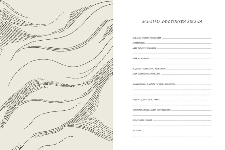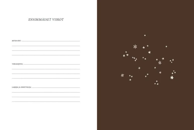 Saana ja Ollis Vjson (Babybok), publicerad av WSOY, fångar de värdefulla tidiga stunderna i din lilla älsklings liv. Den vackert inbundna boken med hård pärm erbjuder utrymme att dokumentera minnen, känslor och milstolpar från ditt barns första år. Boken pryds av Saana Sipiläa och Olli Sallinens fina illustrationer och erbjuder även utrymme för dina egna personliga inslag – vare sig det är teckningar, fotografier eller små minnessaker som betyder mycket för dig och din bebis. Boken är skriven på finska.