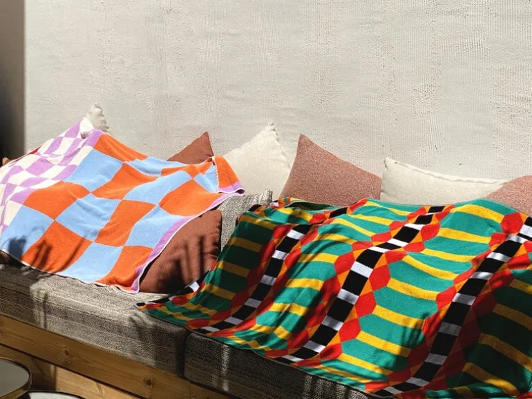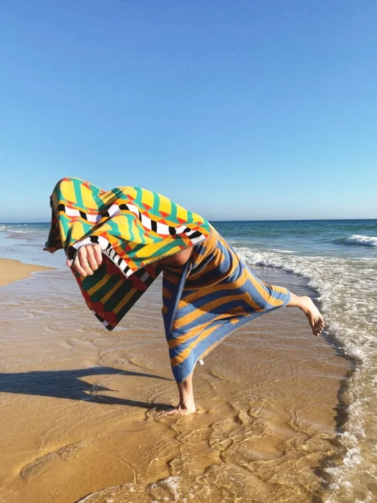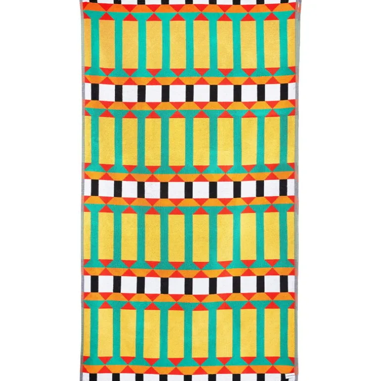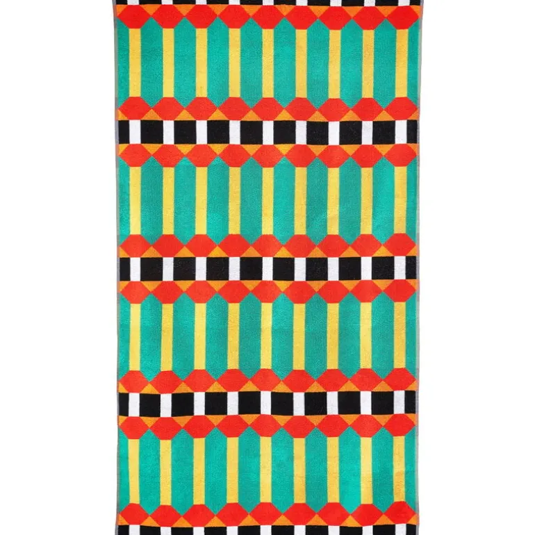 Handduken Beach 1 XL från ZigZagZurich ger ett fascinerande intryck med sitt livfulla mönster, sin glädjerikedom, sina färger och sitt goda humör. Trycket är designat av George Sowden, känd som en av grundarna till designrörelsen Memphis Group. Nu har den brittiske formgivaren återvänt till sina rötter: till geometriska former och mönster, för vilka han ursprungligen fick sitt erkännande. Den livfulla handduken Beach 1 XL utgör inte bara en skönt inslag i hemmets badrum, utan är också en utmärkt följeslagare under soldränkta dagar på stranden, då den är gjord av kvalitetsbomull som snabbt torkar mellan simturerna. Förutom till stranden kan den stora handduken användas som elegant och bekvämt underlag till sommarpicknicken.